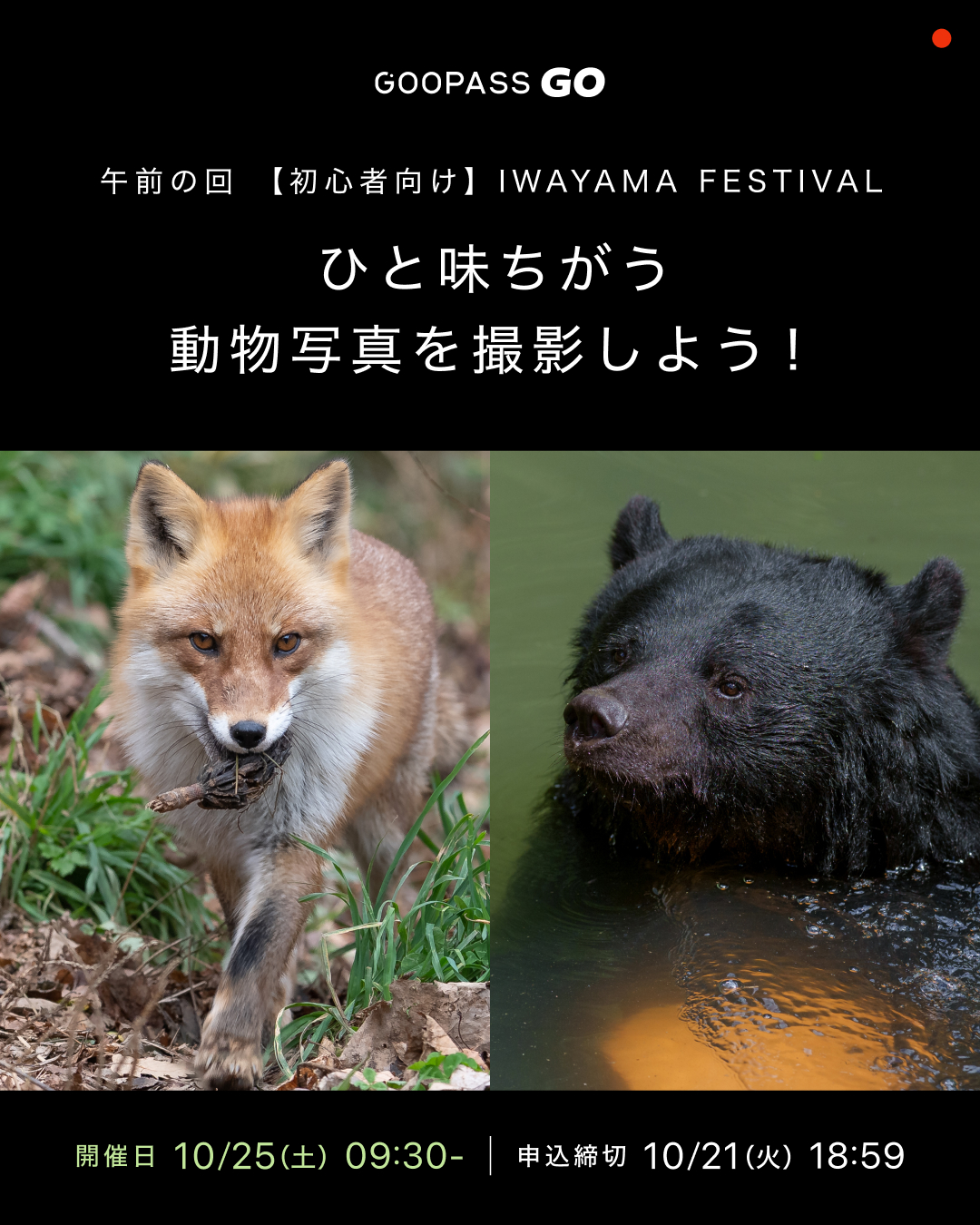 GOOPASS GO #136 10月25日(土)【初心者向け】 IWAYAMA HELLO FESTIVAL ひと味ちがう動物写真を撮影しよう!お申込みはこちら
