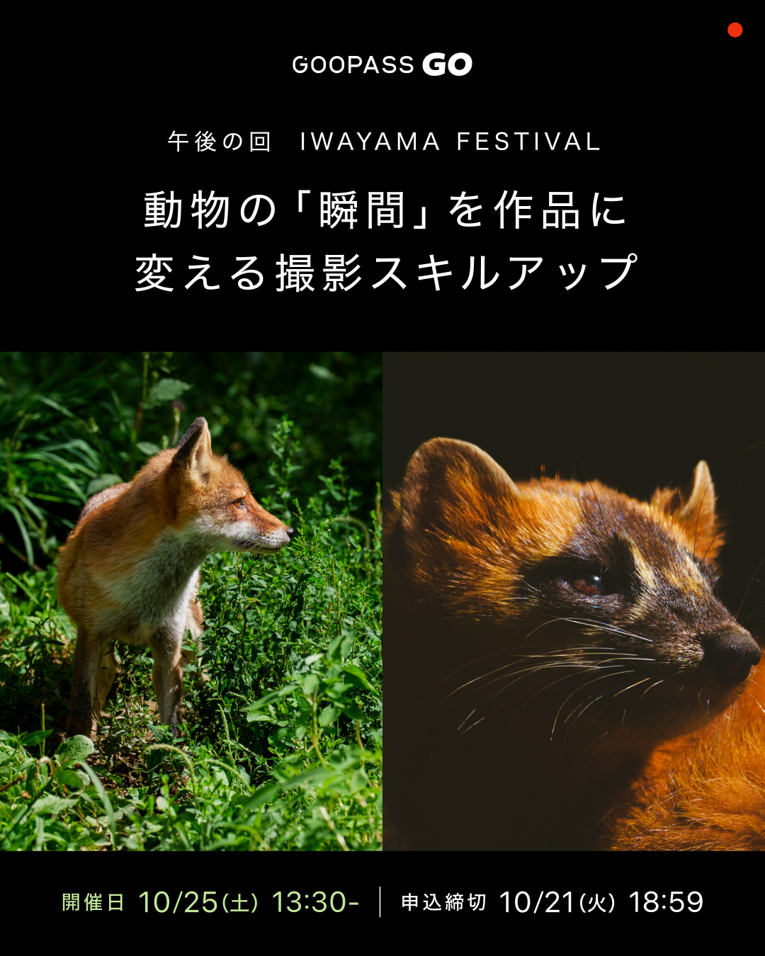 GOOPASS GO #137 10月25日(土) IWAYAMA HELLO FESTIVAL 動物の「瞬間」を作品に変える撮影スキルアップフォトグラフィーお申し込みはこちら