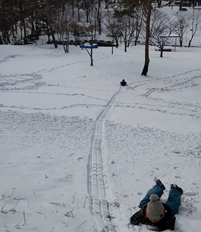 雪遊びはPICNIC FIELDで!ソリの持ち込みOKです。ソリ遊びを楽しみましょう!