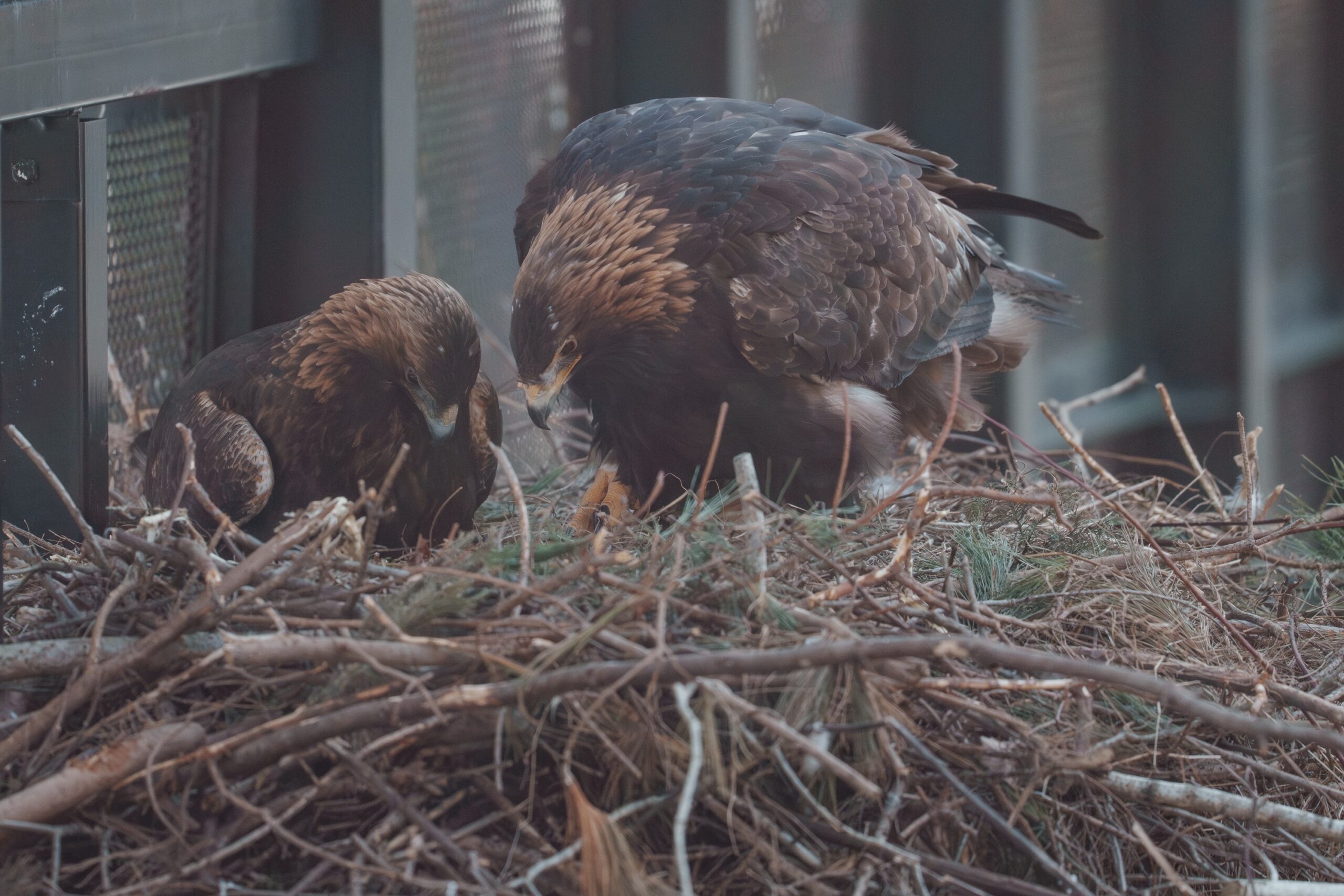 当園のニホンイヌワシは、2026年2月8日(日)に1つ目を産卵し、2月13日(金)に2つ目、2月17日(火)に3つ目の産卵をしました。現在は、メスの“空”とオスの“出羽”が交互に抱卵を行っています。