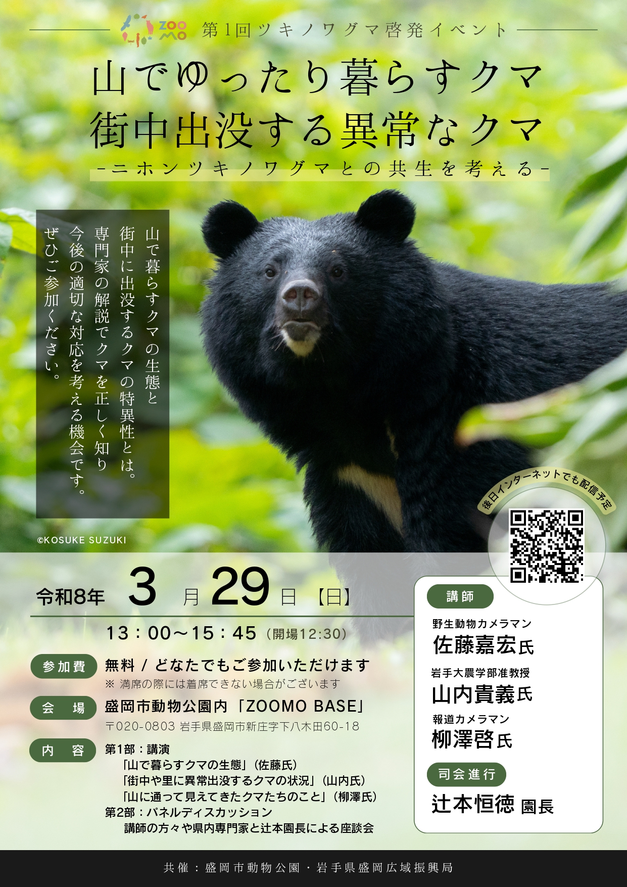 ZOOMOは、岩手県盛岡広域振興局との共催で、一般来園者を対象に、ニホンツキノワグマに関する普及啓発のためのイベントを開催します。