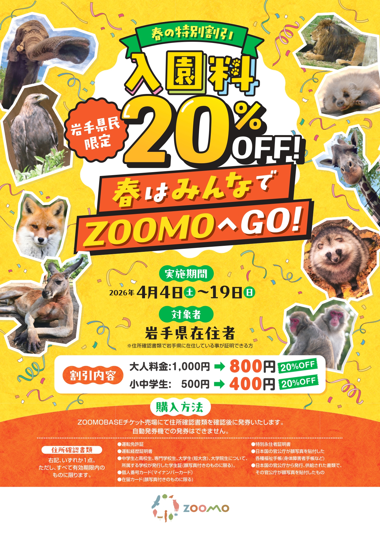 2023年4月のリニューアルオープンから3周年を迎えることを記念して、地域の皆様への日頃の感謝と社会教育施設の利用促進、地域の生物多様性保全に向けた環境教育の機会創出などを目的として、岩手県民限定で入園料が20%OFFになる春の特別割引「春はみんなでZOOMOへGO!」を実施します。