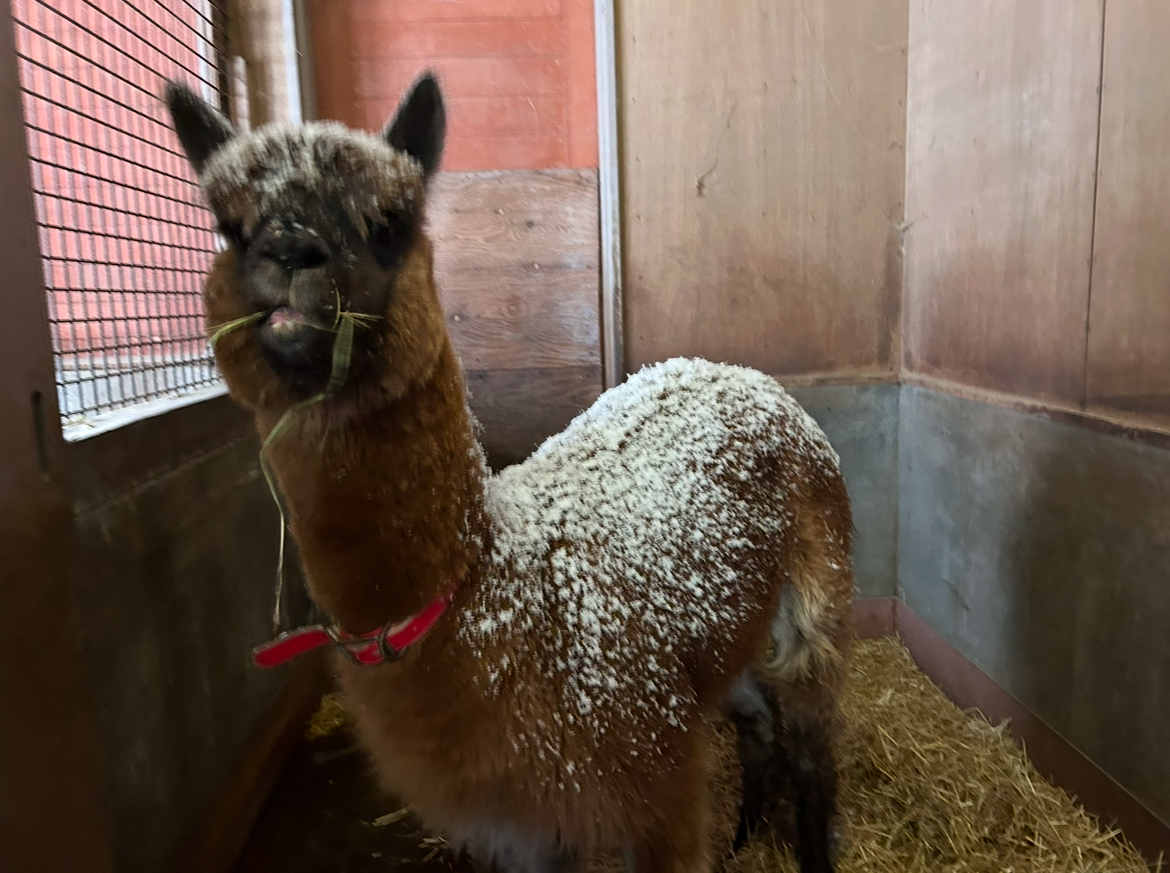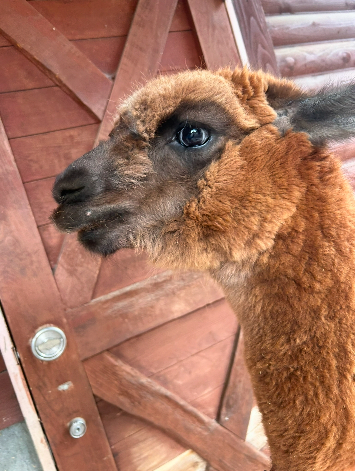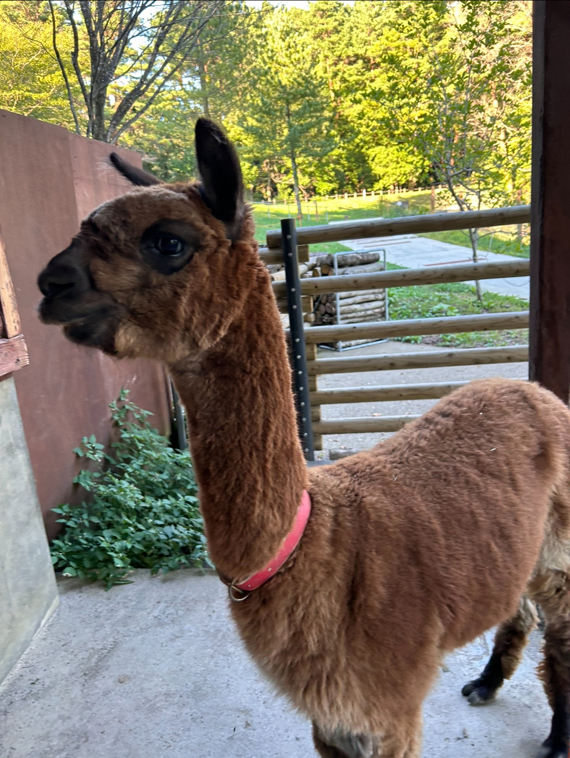 アルパカは、野生種ビクーニャから5000年以上前に家畜化されたと考えられています。同じように野生ラクダ科グアナコから家畜化されたと考えられているラマと比較すると小型で、毛量が多く毛色が豊富なことが特長です。植物性の繊維が育ちにくい高地において衣服の材料として重要な家畜です。繁殖期は決まっておらず、交尾後11か月ほどでふつう1仔を出産します。アルパカは反芻(はんすう)といって、一旦胃の中に入れた草を再び口の中に吐き戻しゆっくり噛みなおすという習性があります。こうすることによって、胃の中で微生物が植物質を分解・消化しやすくなるというメリットがあります。アルパカは恐怖を感じた時や威嚇のためにツバを吐くことがあるのですが、このツバの中には反芻で吐き戻した胃液と植物の破片が含まれています。直撃をうけると、散弾のような固形物と相当の悪臭により手ひどいダメージを受けます。飼育下では平均して20年ほどの寿命です。