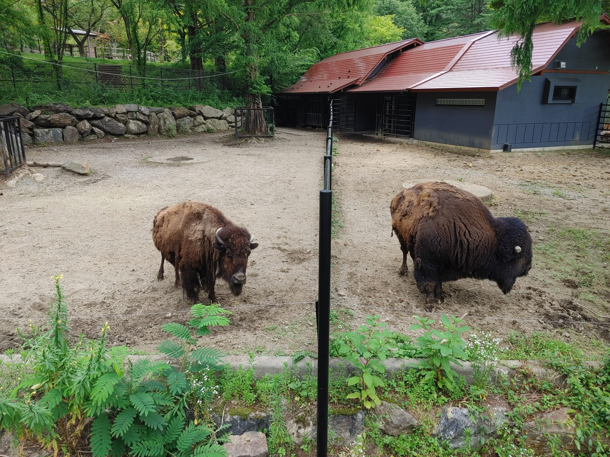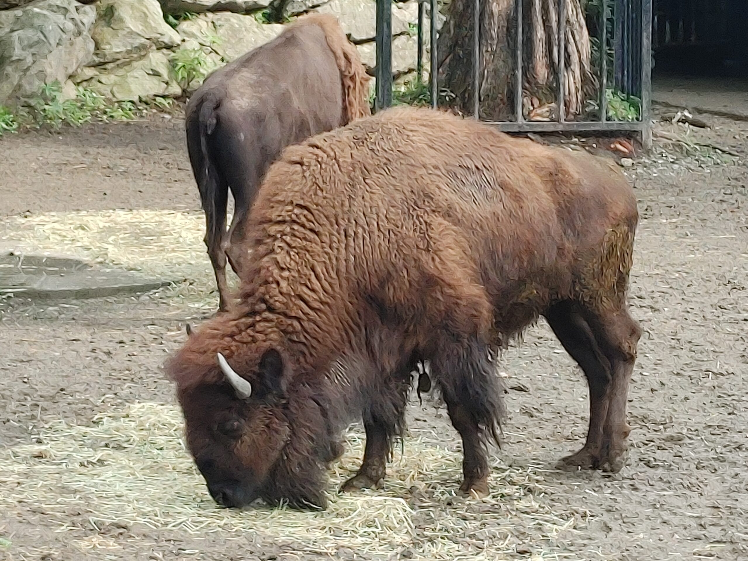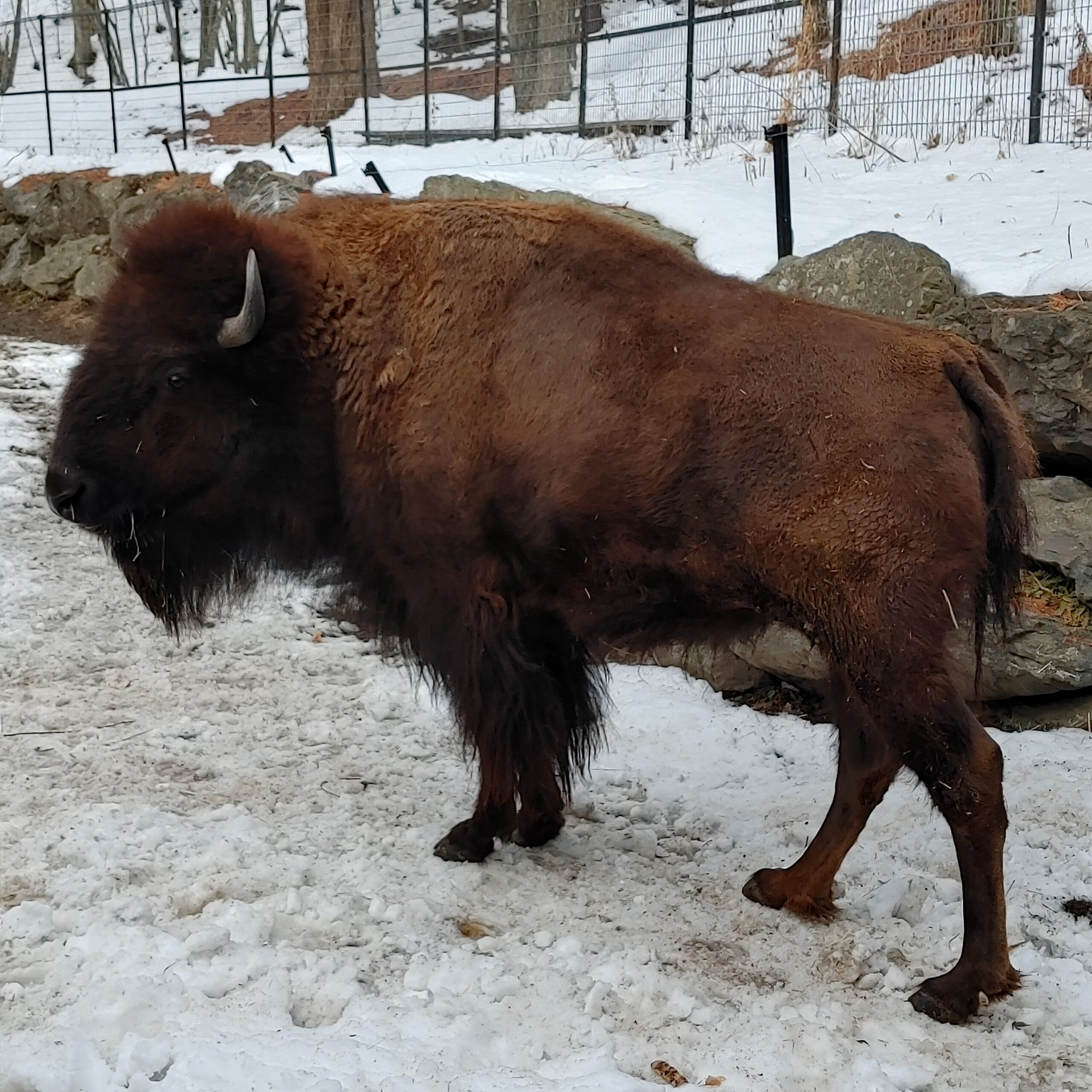 黒く縮れた毛で覆われた大きな頭部と、それを支えるために発達した肩の大きな筋肉が特徴的です。体格はオスの方がメスよりも2回りほど大きく、体重は1tを超えることもあります。角は短いながらもオスメス共にあり、わずかに湾曲しています。全身は黒色もしくは茶褐色の毛で覆われ、特に冬毛は耐寒性、断熱効果に優れ、雪が積もっていても平然としています。昼行性で朝や夕方に活発に活動し、草類や木の葉、低木や小枝等を主食としています。10~30頭の群れで生活していますが、繁殖期以外のオスはオス同士、メスはメスとその子供からなる別々の群れを作り暮らしています。かつては広大なアメリカ大陸に数千万頭生息していたといわれるアメリカバイソンは、食用や皮革目的の捕獲の他、農業や牧畜の障害となる害獣としての駆除や娯楽目的の乱獲、または農耕文化を持たずバイソンの狩猟に頼っていたネイティブアメリカンの生活基盤を奪う目的のための捕殺など、様々な理由によってその数を数百頭まで減少させ、絶滅の危機にまで追いやられました。現在の生息数状況は、政府の保護政策のもと保護区を中心に回復していますが、個体数は安定しているとは言えず、準絶滅危惧種としてレッドリストに指定されています。