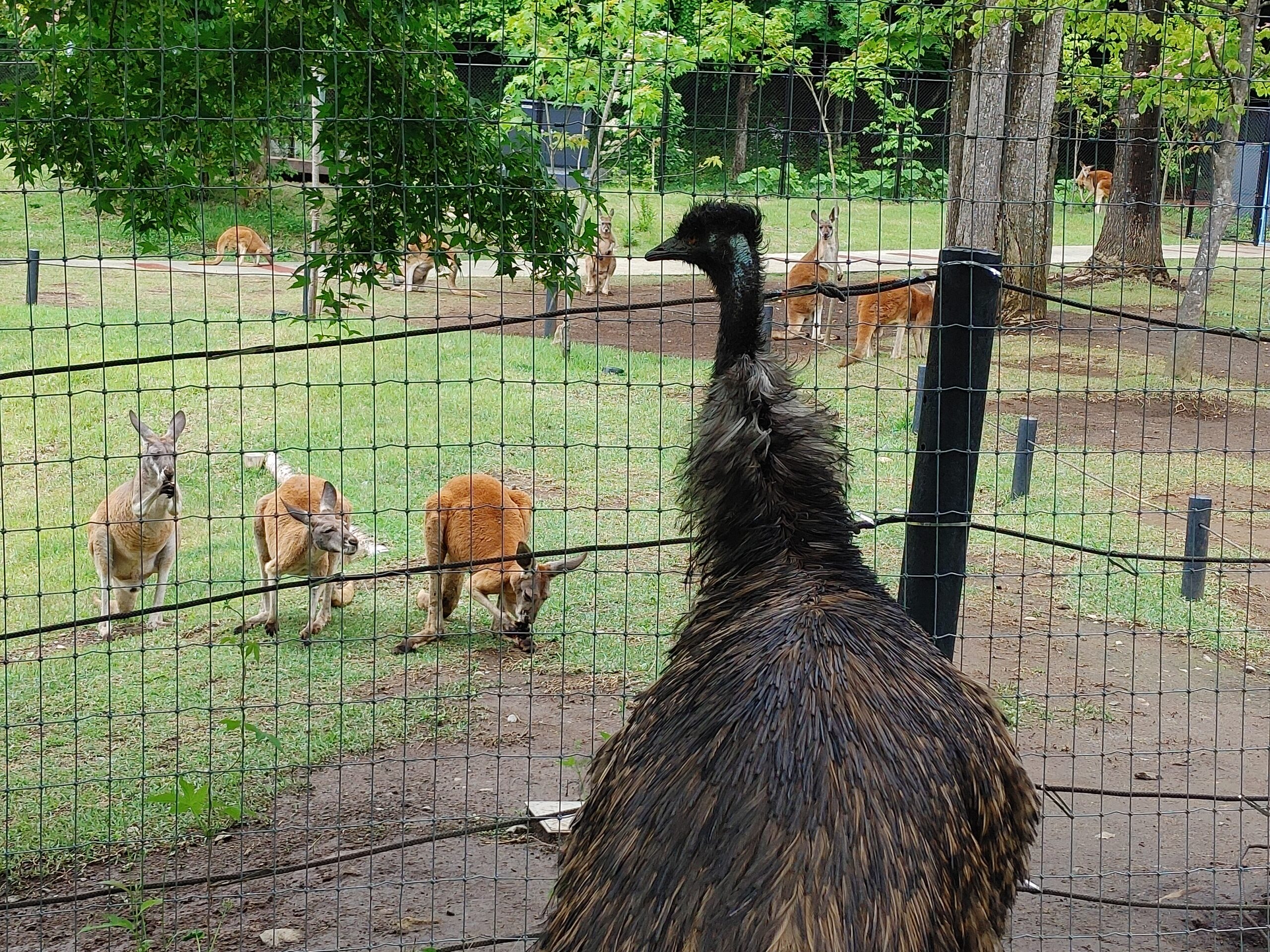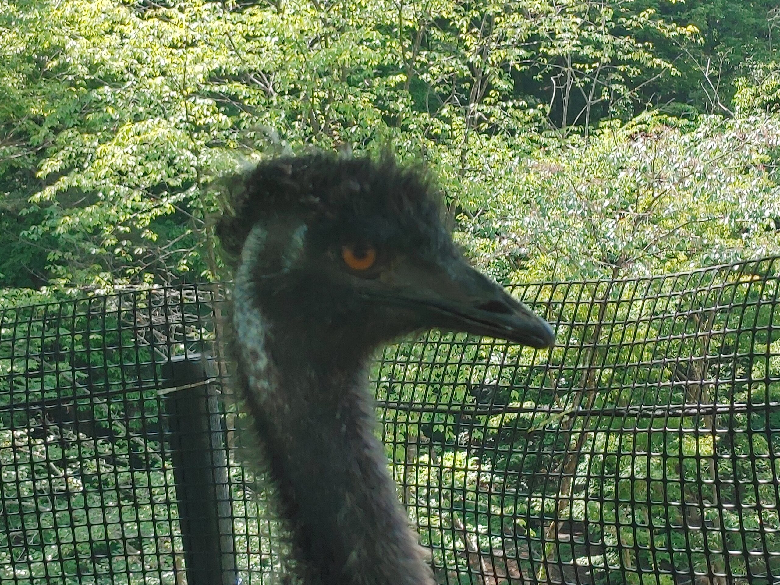 鳥類の中ではダチョウの次に大きい飛べない鳥です。見た目はダチョウに似ていますが、首から頭部にかけても長い羽毛が生え、足の指は3本で各々に頑強な爪があります。翼は退化し、体の大きさと比較しても非常に小さく20cm程度で、先端に1本の爪がありますが普段は羽毛に埋もれて確認できません。また、体格はオスよりメスの方が大きいのですがオスもメスも羽毛は灰褐色で、外見からオスメスを判別することは困難です。羽毛は2本が一対となった特殊な形状をしていて、羽にボリュームを付けることで保温機能を高めたり、体を大きく見せたりする説や求愛行動に役立っているという説がありますが、実のところは良く分かっていません。雑食性で主に昆虫、果実、種子、草類を食べます。普段はゆったりと歩きますが、時速50㎞で走ることもあります。雨に濡れることを気にせず、水浴びも大好きです。3~10月の繁殖期にオスは地面に枯葉や草などを敷いた簡単な巣を作り、メスはそこに550~600g程度大きさで濃緑色の卵を10~20個産みます。メスは卵を産み終わると巣を離れ、別のオスとの繁殖に備えます。その後残されたオスは42~52日間飲まず食わず、排泄もせず卵を温め、体重も2/3まで減少します。また、孵化した雛の世話も残されたオスが行います。寿命は20~30年で、基本的には温和な性格をしていますがヒトに対する興味が強かったり、逆に警戒心が強かったりと個体によって差が見られます。