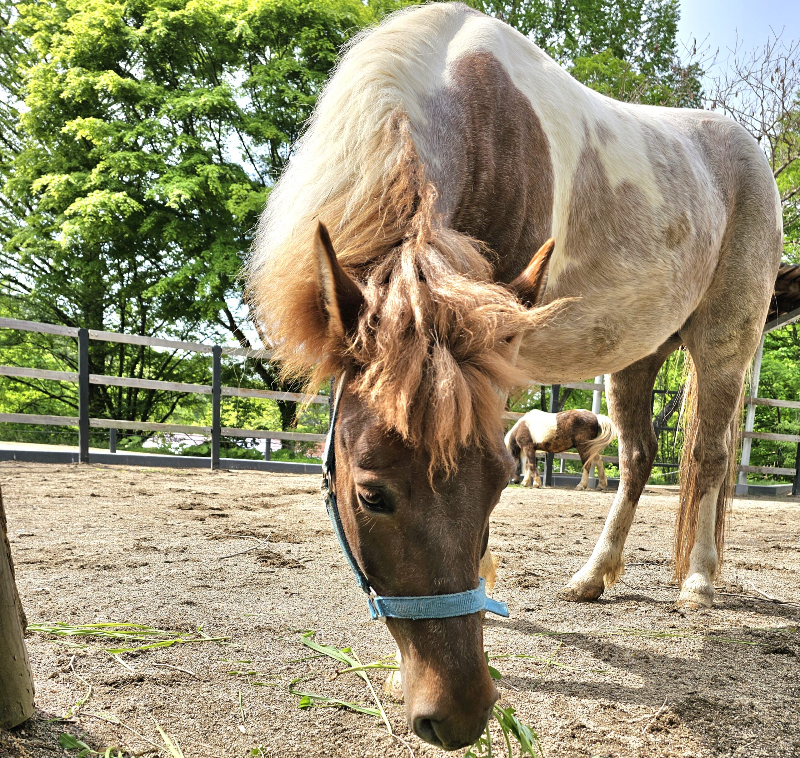 ポニーとは家畜用に改良された小型のウマのことで、肩までの高さが148cm以下のウマの総称とされています(147cm以下とされる場合もある)。そのため、肩までの高さが70cm程度の小さなウマもポニーと呼ばれます。毛色は様々な色があります。白や茶色、黒色や灰色、白色と茶色のまだら模様など個体によって様々です。ポニーは体が小さいですがとても頑丈で、体重の2倍もの荷物を引くことができることから、古くから使役動物として飼育されてきました。走ると時速40キロほどのスピードは出すことができ運動能力にも優れています。草食性で、ZOOMOのポニー達は干し草を中心にたまにおやつとしてリンゴやニンジンも食べています。体調や年齢によってもふすまや干し草を細かく砕いた粉砕ヘイキューブを与えています。胃が小さいので一度にたくさんの量は食べられませんが、消化器官はとても強いので堅い草なども消化することができます。ウマの睡眠時間は短く、平均3~4時間ほどです。これは、自然界で常に周囲に警戒していたことの名残だとも言われています。睡眠姿勢も横になることが少なく、立ったままで浅く短い睡眠をとることがほとんどです。